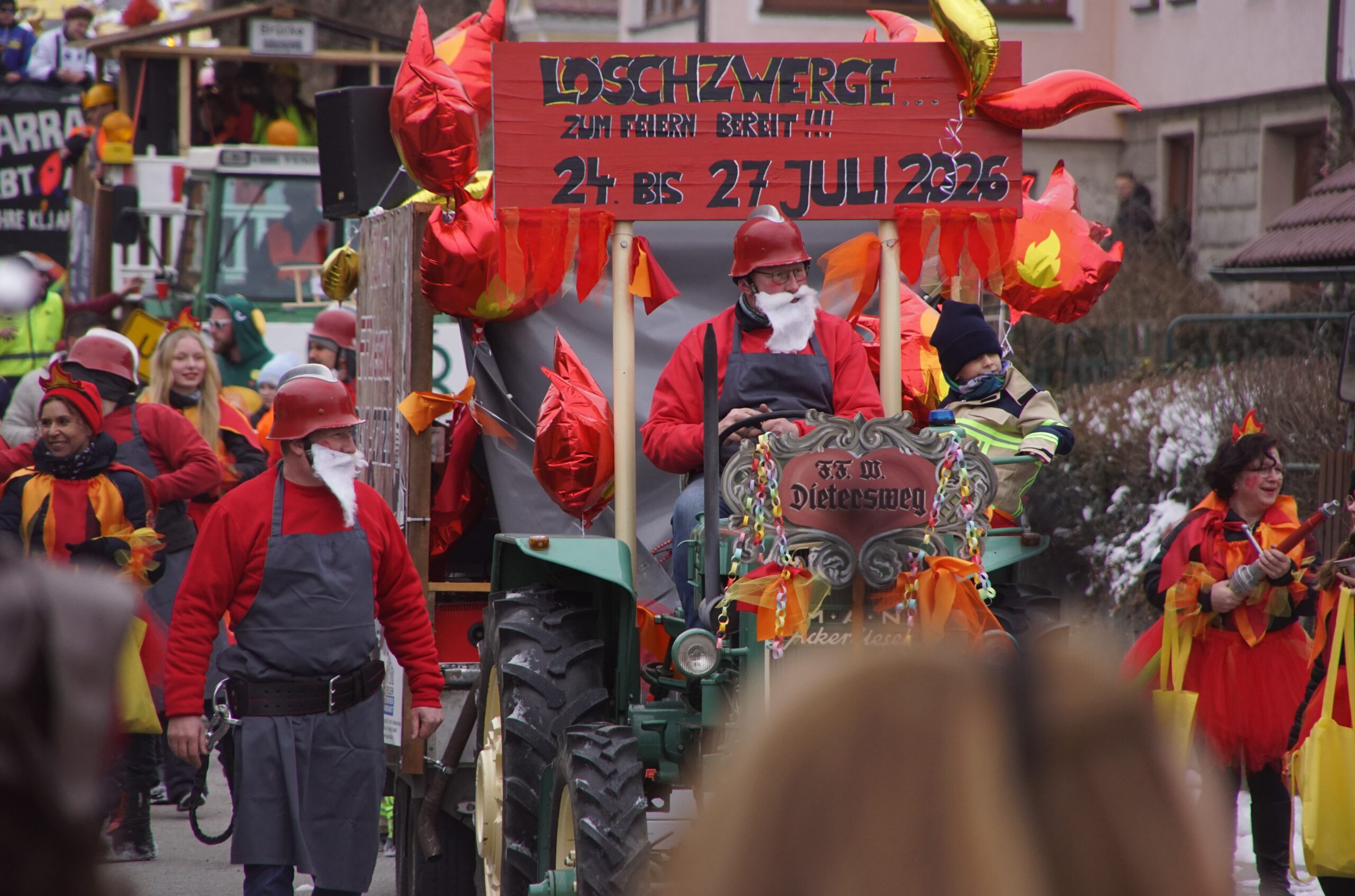 Um für unser Fest die Werbetrommel zu rühren, haben wir uns am Faschingszug in Wörth beteiligt. Die Faschingsgesellschaft Narradonia Wörth hat alles bestens organisiert. Es war ein tolles Erlebnis, hier als Fußgruppe dabei sein zu dürfen. Mit dabei war auch ein Bulldog-Oldtimer mit Anhänger, an dem unsere Werbebanner angebracht wurden. Unser Motto lautete: „Löschzwerge – Zum Feiern bereit! 24. bis 27. Juli 2026“. Die Männer verkleideten sich als Löschzwerge, die Damen und Festmädchen als Flammen. Die Kinder gingen als kleine Feuerwehrfrauen und -männer mit und als Grisu, der kleine Drache. Es war einiges an Vorbereitungsarbeit zu erledigen. Die Kostüme mussten beschafft, verfeinert und zusammen gestellt werden, eine Musikanlage samt Nebelmaschine und Stromaggregat wurde installiert und Süßigkeiten sowie Getränke mussten organisiert werden. Unser Festwirt Alois Hamperl spendierte das Bier für die Zuschauer! Aber die Anstrengungen haben sich gelohnt – wir hatten viel Spaß! Und auch aus den Reihen der Faschingszug-Besucher kam viel Lob für unsere Aktion! Vormittags stärkten wir uns mit Weißwürstl und im Nachgang gab es für einige noch eine Absacker im Gasthaus Rosenhof.
