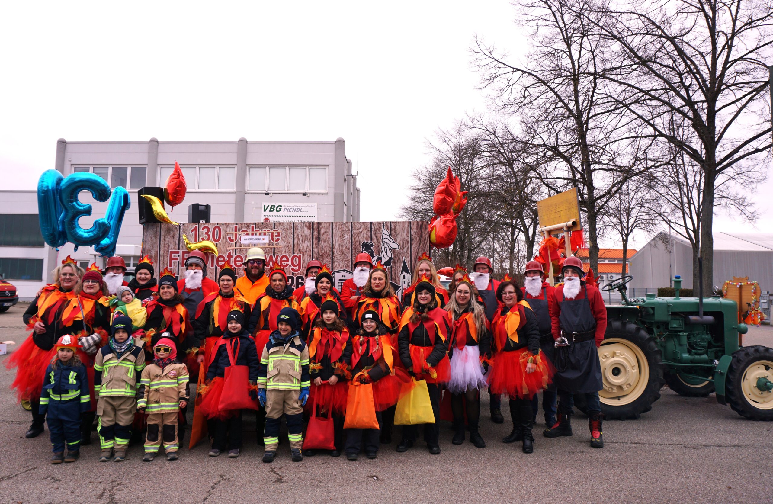 Um für unser Fest die Werbetrommel zu rühren, haben wir uns am Faschingszug in Wörth beteiligt. Die Faschingsgesellschaft Narradonia Wörth hat alles bestens organisiert. Es war ein tolles Erlebnis, hier als Fußgruppe dabei sein zu dürfen. Mit dabei war auch ein Bulldog-Oldtimer mit Anhänger, an dem unsere Werbebanner angebracht wurden. Unser Motto lautete: „Löschzwerge – Zum Feiern bereit! 24. bis 27. Juli 2026“. Die Männer verkleideten sich als Löschzwerge, die Damen und Festmädchen als Flammen. Die Kinder gingen als kleine Feuerwehrfrauen und -männer mit und als Grisu, der kleine Drache. Es war einiges an Vorbereitungsarbeit zu erledigen. Die Kostüme mussten beschafft, verfeinert und zusammen gestellt werden, eine Musikanlage samt Nebelmaschine und Stromaggregat wurde installiert und Süßigkeiten sowie Getränke mussten organisiert werden. Unser Festwirt Alois Hamperl spendierte das Bier für die Zuschauer! Aber die Anstrengungen haben sich gelohnt – wir hatten viel Spaß! Und auch aus den Reihen der Faschingszug-Besucher kam viel Lob für unsere Aktion! Vormittags stärkten wir uns mit Weißwürstl und im Nachgang gab es für einige noch eine Absacker im Gasthaus Rosenhof.