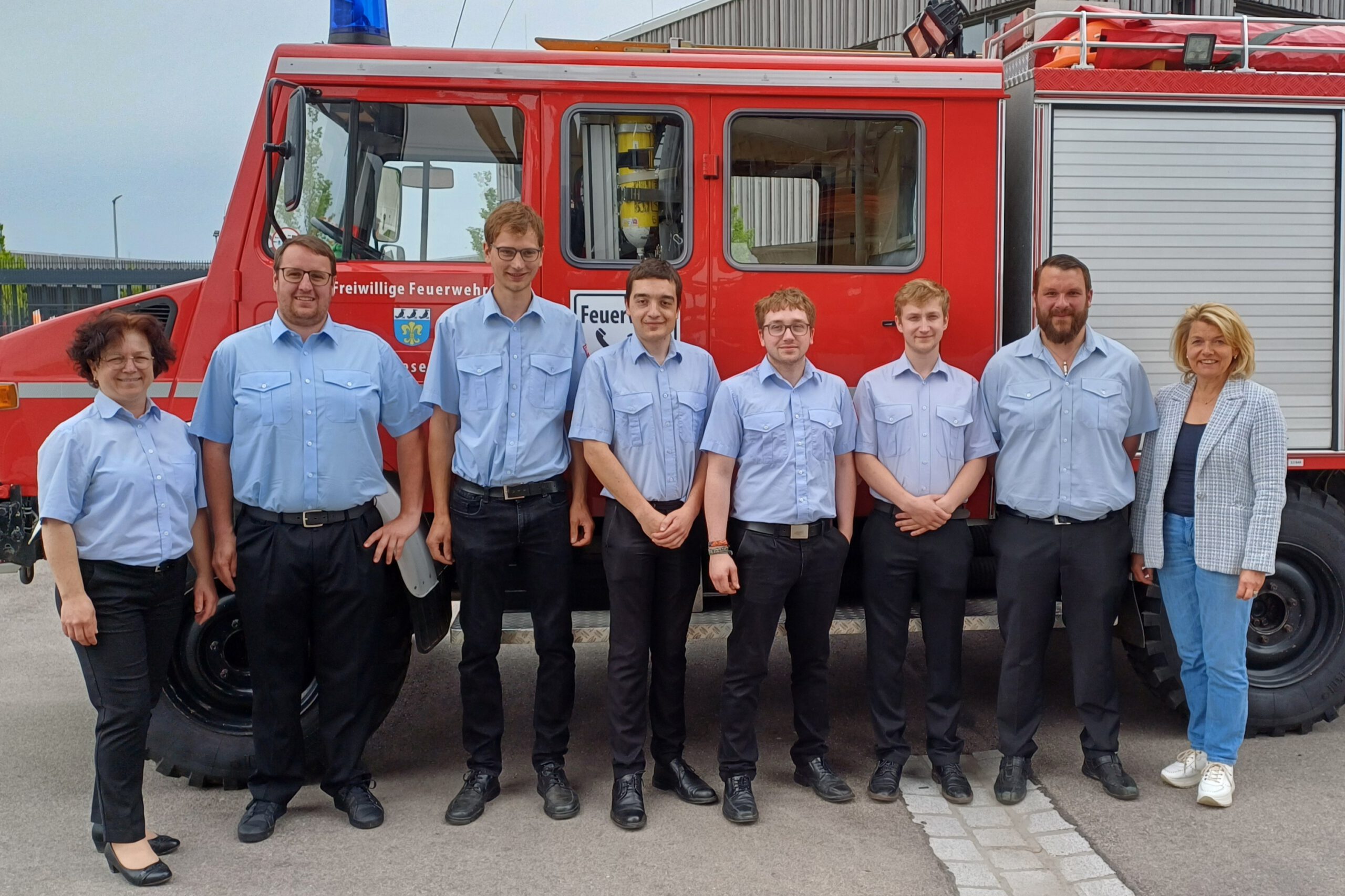 v.l.: stellvertr. Kommandantin Sandra Meilinger, Kommandant Martin Bauer, Andreas Mühlbauer, Bürgermeisterin Elisabeth Kerscher, Manfred Ohlschmid, Landrätin Tanja Schweiger und Kreisbrandrat Johann Bornschlegl.